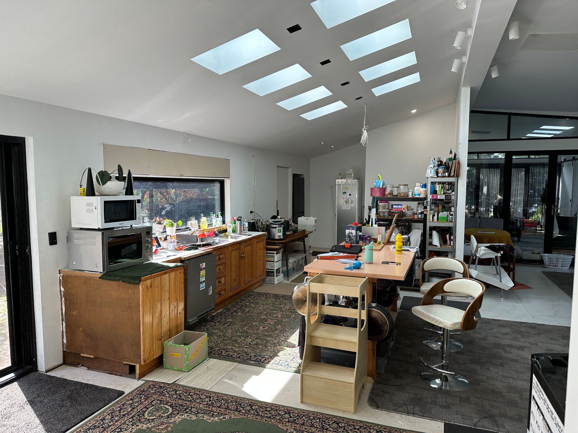 - Angled solid timber shelves which wrap-around corner wall from living area to dining zone