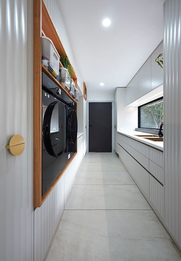 Our team designed and crafted ample bench space for tasks, an expanse of customised cabinetry for a clutter-free work zone, a timber-veneer frame around the washing and drying machines, and a seamless design flow from their stunning kitchen.