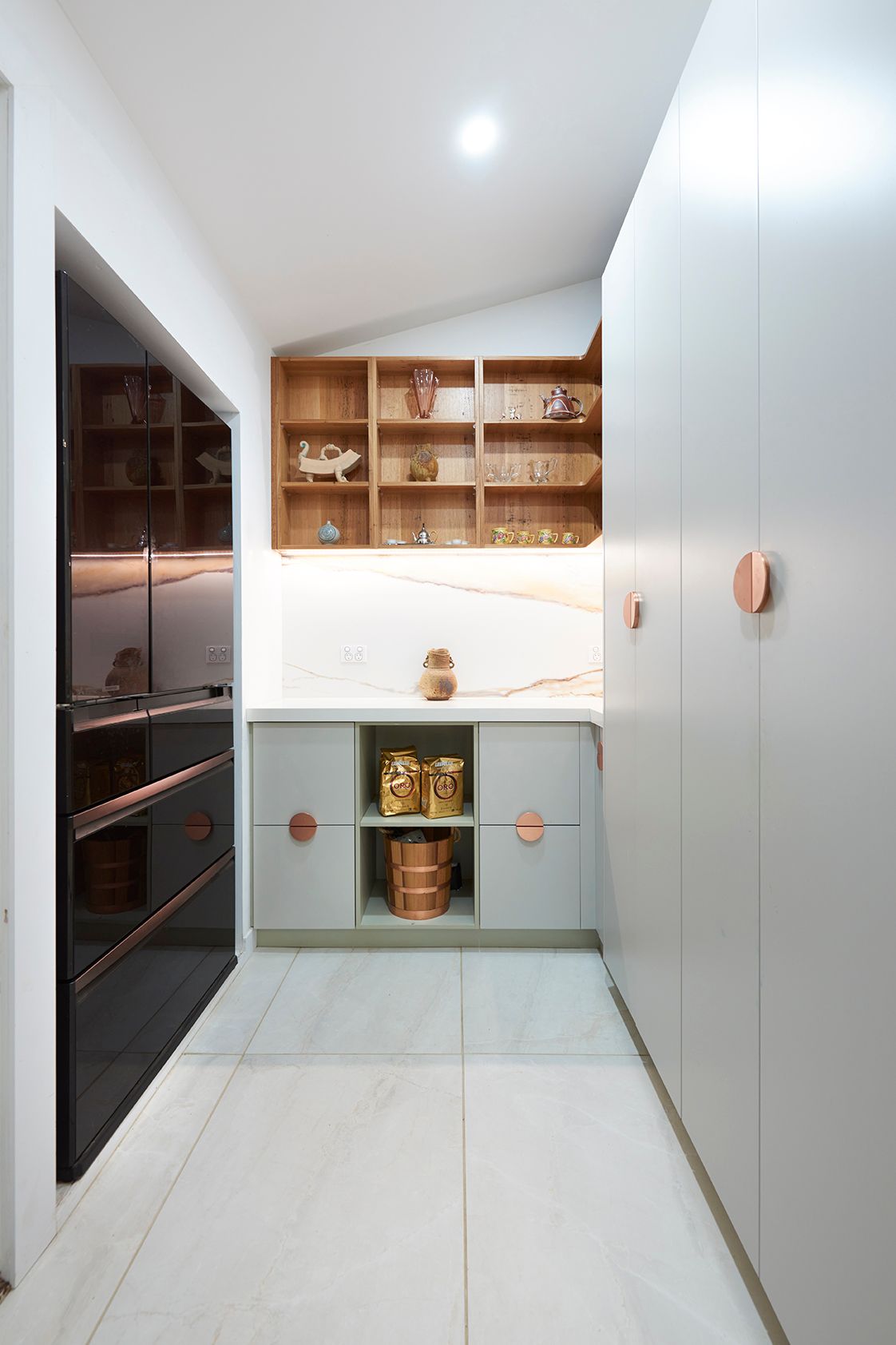 - Open shelves in Wormy Chestnut timber veneer in kitchen, butler’s pantry and laundry