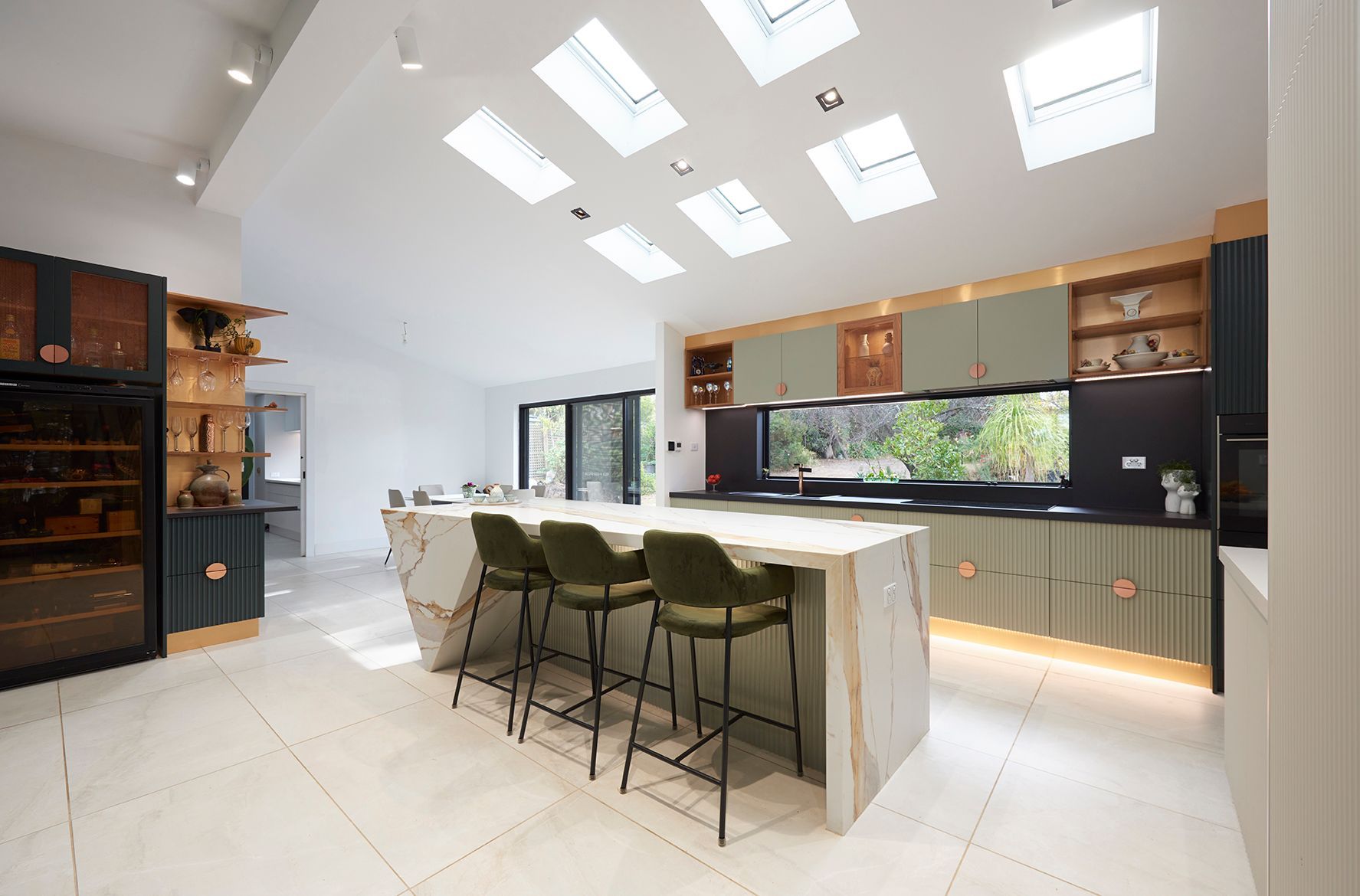 Ross and Sharyn’s bespoke stone island kitchen anchors the mix of shapes, colours and materials flowing from kitchen with butler’s pantry to beverage bar in the open-plan living and dining space, and custom-made laundry cabinets.