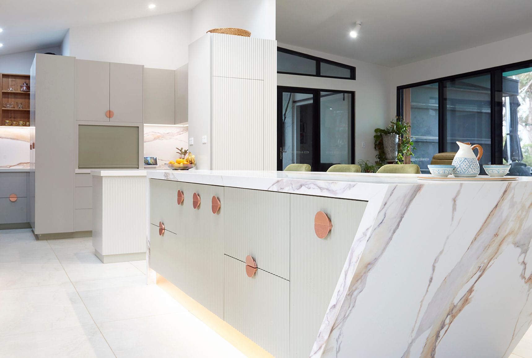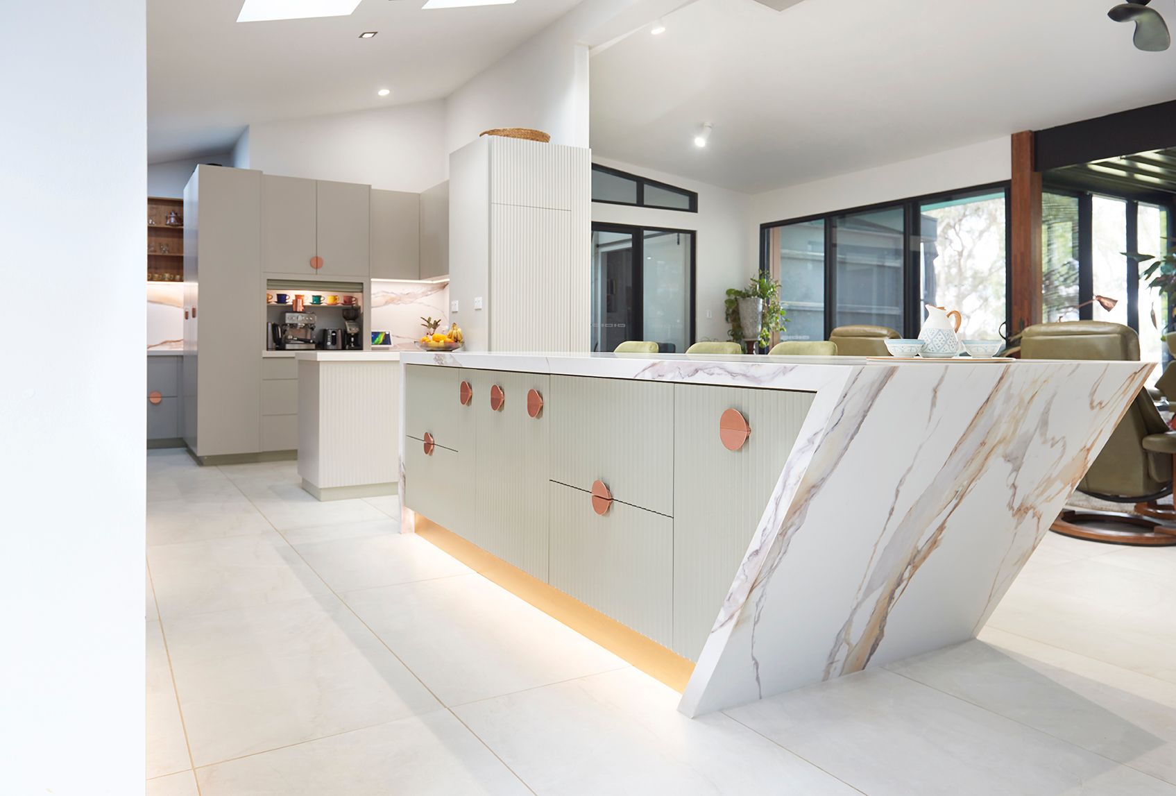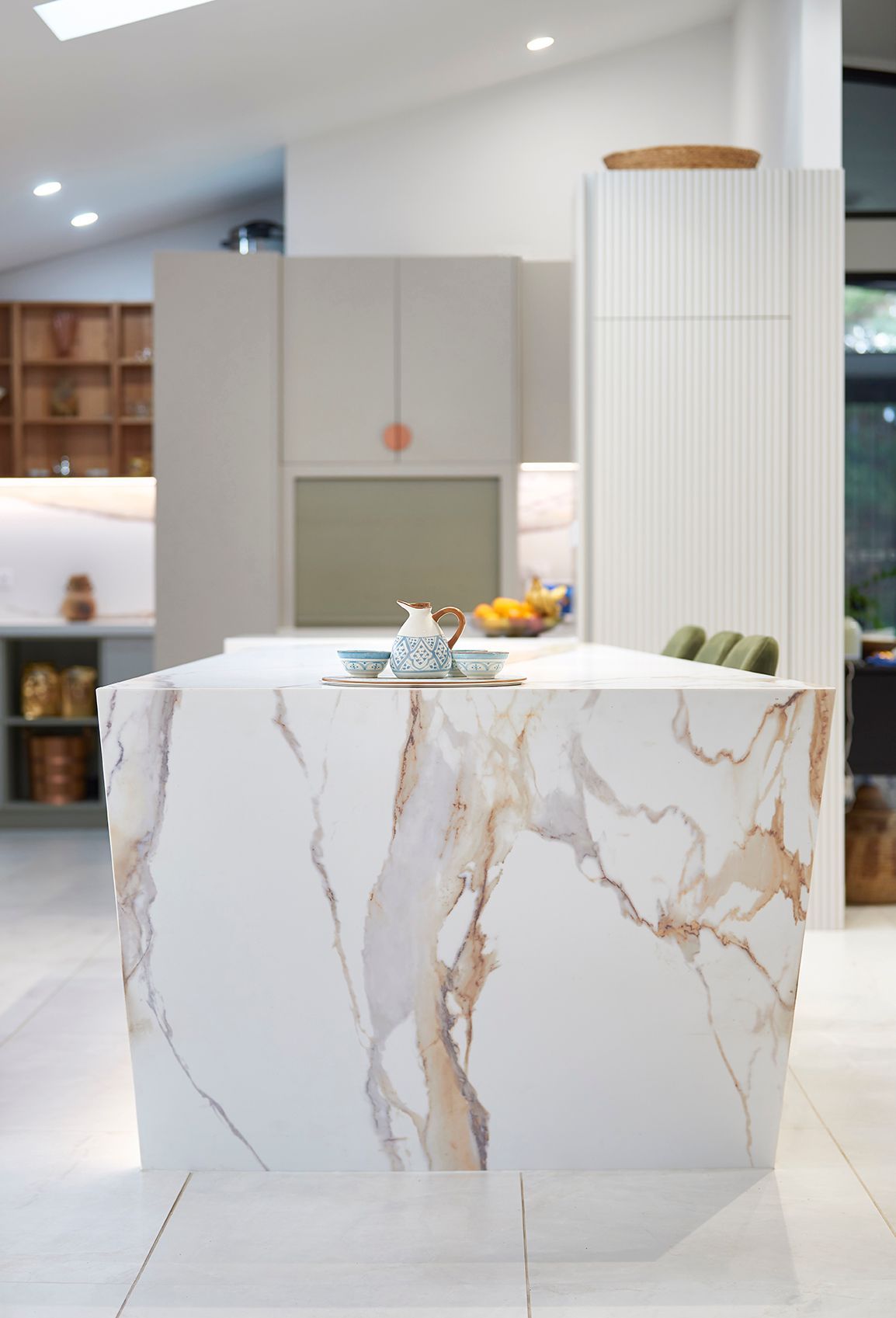 The kitchen island in Quantum Quartz Angelico Palazzo has a classic waterfall edge (90° angle) on the stone benchtop’s narrower end (closest to ovens) and a bold 60° angle on the wider end, which borders the hero design feature: an inverted triangle of stone spilling from benchtop to floor tiles.