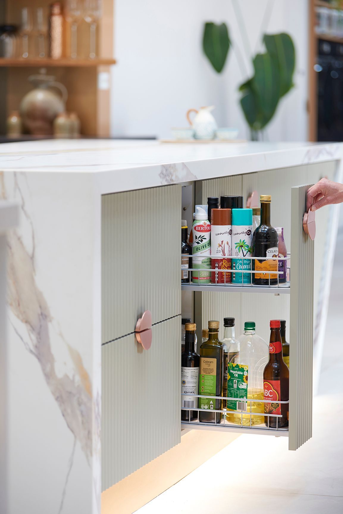 Our design and manufacturing team have ensured the stone kitchen island’s triangle feature is not a void space by including an angled cupboard with internal shelves for kitchen storage – and more visual impact to the geometric kitchen design.