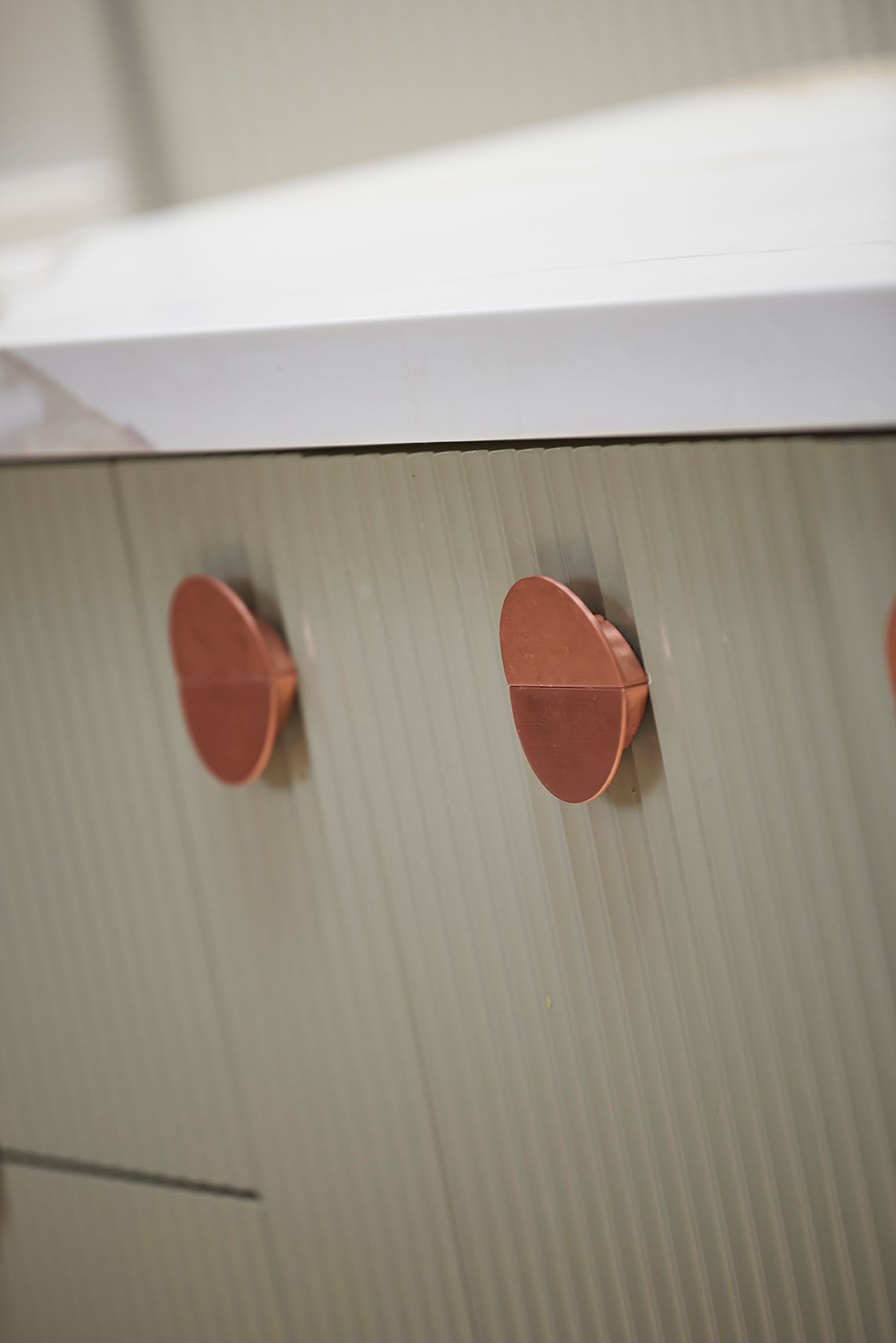 - Semi-circle copper handles, positioned to create a circle effect with adjoining cabinets
